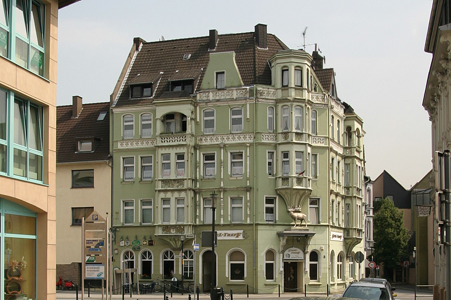 Über dem Eingang des Hauses Teichstraße 7 steht der „Goldene Hirsch“. Das eindrucksvolle Eckgebäude aus der Zeit um 1900 ist mit reichem, neogotischen Fassadenschmuck ausgestattet.