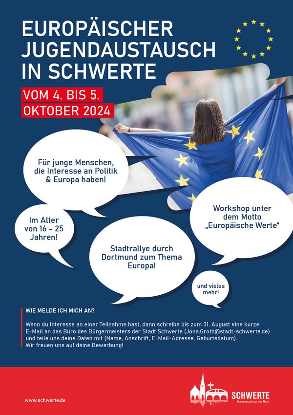 Schwerte. Die Stadt Schwerte lädt im Oktober 2024 junge Menschen aus den europäischen Partnerstädten zum ersten „Europäischen Jugendaustausch“ in die…
