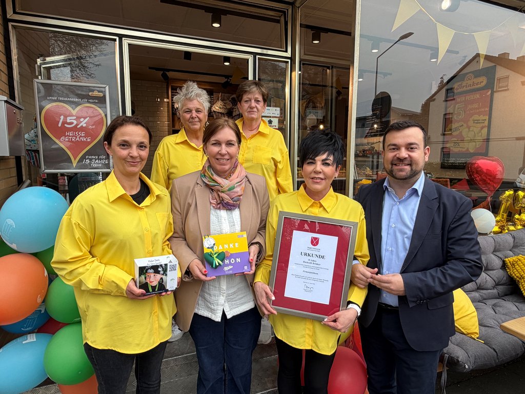 Anlässlich des Jubiläums besuchte Bürgermeister Dimitrios Axourgos das Backcafé Brinker und überreichte dem Team eine Urkunde sowie Glückwünsche der Stadt. „Mein Dank gilt dem gesamten Team, das Tag für Tag mit großem Einsatz und Verlässlichkeit zu diesem Erfolg beiträgt“, sagte Axourgos. „Ich wünsche dem Backcafé Brinker weiterhin viele zufriedene Gäste und noch viele erfolgreiche Jahre in unserer Stadt.“