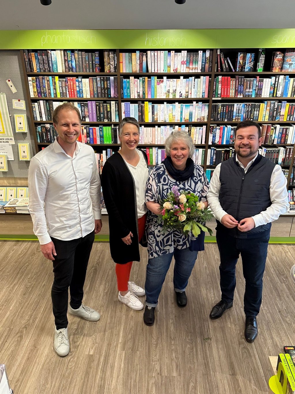 Besonders reizvoll findet das Stadtoberhaupt die Idee von Eva Stapper, der Stadt Schwerte einen Literaturpfad zu schenken. Schon bei seinem Besuch gemeinsam mit Michaela Zorn-Koritzius (Schwerte Stadtmarketing) und Jens Ewald (Technopark und Wirtschaftsförderung) im Rahmen des so genannten Firmenfreitags hatte die Inhaberin der Buchhandlung dem Bürgermeister Pläne dazu überreicht. Ihr Angebot erneuerte sie am Samstag. „Ich finde die Idee und das Geschenk von Frau Stapper toll und ich bin begeistert von dieser Verbundenheit zu Schwerte. Wir werden alles möglich machen, um das Projekt an einem schönen Standort umzusetzen“, versprach Dimitrios Axourgos.