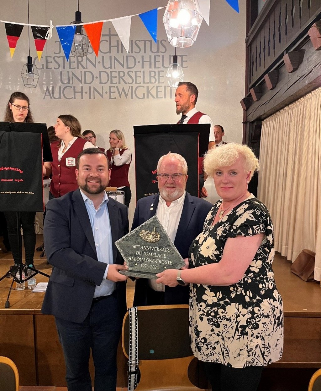 Seit nunmehr 50 Jahren verbindet Schwerte und Allouagne eine enge Städtefreundschaft. Anlässlich des Jubiläums organisierte der Arbeitskreis Allouagne um seine Vorsitzende Edelgard Holtschmidt eine Feier im Ev. Gemeindehaus in Ergste. Mit dabei waren neben vielen Bürger*innen aus Schwerte auch zahlreiche Gäste aus Allouagne, die zurzeit am jährlichen Austausch teilnehmen. Neben Holtschmidt und dem Vorsitzenden des Comités aus Allouagne, Bruno Allart, richtete auch Bürgermeister Axourgos seine Worte an die Gäste und dankte allen Beteiligten und Ehrenamtlichen für ihren engagierten Einsatz für die Städtepartnerschaft.