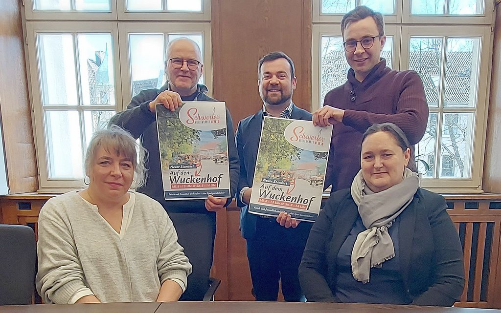 Das sei auch beim zweiten Wochenmarkt am 10. September so gewesen. Nur wenige Kleinigkeiten müssten optimiert werden, hatten Holtmann und Berger nach der Zweitauflage festgestellt. Unter anderem darüber sprach die Runde am Montag. Grundsätzlich hielten Jan Holtmann und Stephan Berger an der positiven Haltung zum Wuckenhof fest. Darüber freute sich Dimitrios Axourgos. „Im Sinne aller Schwerter*innen und im Sinne aller Markthändler*innen begrüße ich es sehr, dass wir einen schönen Platz in direkter Nachbarschaft zum Marktplatz als Alternative anbieten können“, sagte das Stadtoberhaupt.