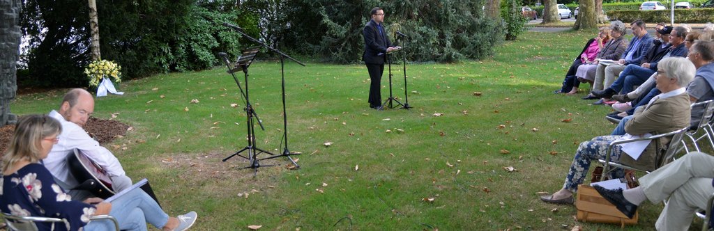 Im Gedenken an die Opfer von Krieg und Willkür legten Dimitrios Axourgos und Fritz-Günter Held einen Kranz nieder mit der auf den Kranzschleifen aufgedruckten Botschaft: "50 Jahre Neue Ostpolitik zeigen: Verständigung und Handel schaffen Frieden!" Für den musikalischen Rahmen hatte Uli Röder gesorgt.