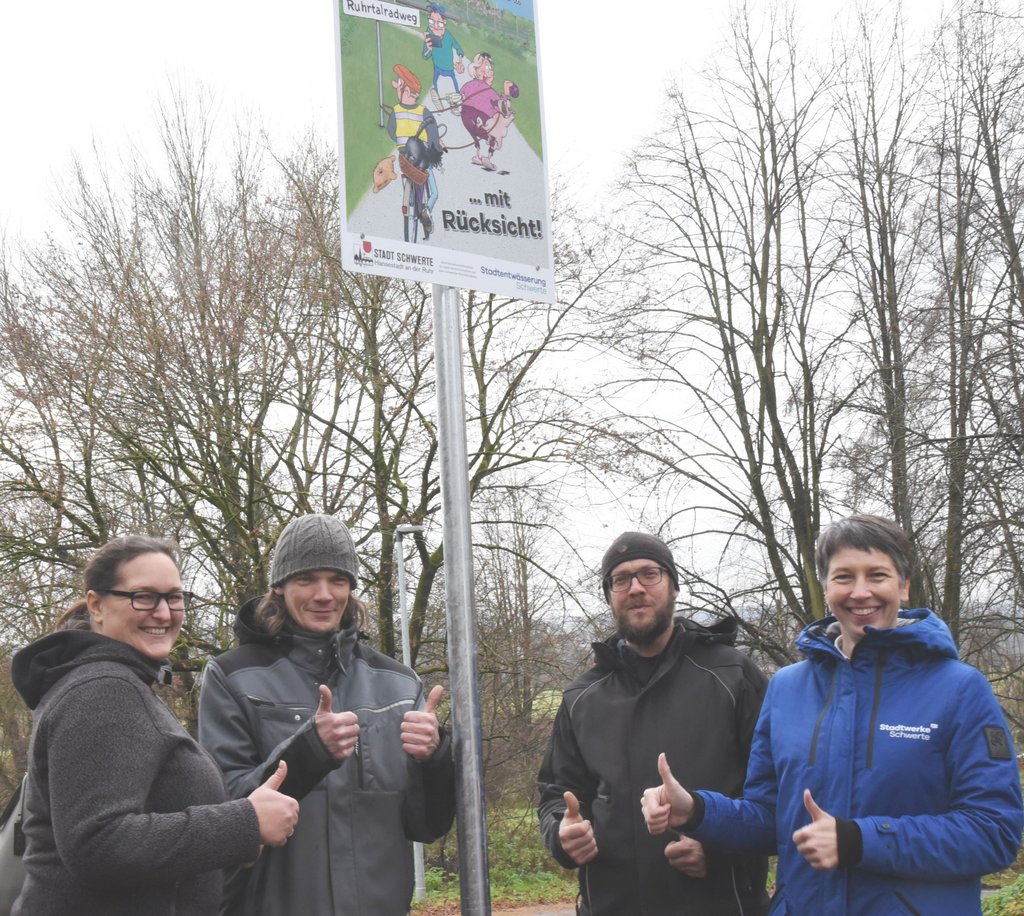 So hat das Ordnungsamt der Stadt Schwerte in Zusammenarbeit mit den Stadtwerken ein Motiv für Schilder entworfen, die mithilfe des Baubetriebshofes der Stadt an jeder Hauptzugangs- bzw. -zufahrtsstelle zum Ruhrtalradweg aufgestellt worden sind. Dieses Motiv zeigt einen Fußgänger, eine Hundehalterin und einen Radfahrer. Es ist verbunden mit den Worten „Gemeinsam durch Schwerte - …mit Rücksicht“ und appelliert an die Toleranz und das gegenseitige Verständnis der Verkehrsteilnehmer*innen.