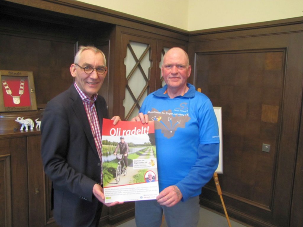 Seine letzte Tor als Botschafter des Vereins "Engel mit Herz ist eine "Vier-Flüsse.Radtour", danach möchte Oliver Trelenberg seine Aktion "Oli radelt" in anderer Form fortführen. Seine mehrwöchige Radreise führt ihn von Dresden über Schwerte nach Hagen, wo er heute lebt. Die Gesamtstrecke beträgt 1525 Kilometer. Der "Verein Engel mit Herz" ermöglicht mittellosen Krebspatienten einen kurzweiligen Urlaub und erfüllt Wünsche von Schwerstkranken. 2013 war Oliver Trelenberg selbst an Kehlkopfkrebs erkrankt. Mit seinen Radprojekten trägt er dazu bei, dass diese Menschen neuen Lebensmut finden und Kraft für den Alltag schöpfen. "Ich ziehe den Hut vor Oliver Trelenberg, der mit seiner Aktion nicht nur finanzielle Unterstützung leistet. Sein Engagement hat auch einen ideellen Wert, denn es vermittelt positive Energie", sagte Bürgermeister Heinrich Böckelühr.