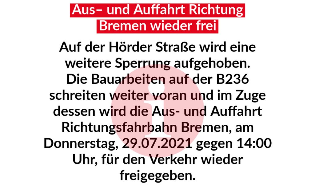 Die Bauarbeiten auf der B236 schreiten weiter voran und im Zuge dessen wird die Aus- und Auffahrt Richtungsfahrbahn Bremen, am Donnerstag, 29.07.2021 gegen 14:00 Uhr, für den Verkehr wieder freigegeben.