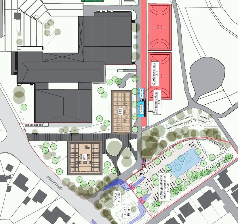 Dazu werden der Bauzaun sowie die Büro- und Mannschaftscontainer aufgestellt. In der zweiten Ferienhälfte wird eine provisorische Zufahrt zur südlich gelegenen Parkplatzfläche errichtet, um dann die provisorischen Parkflächen vor dem Interimscontainer erschließen zu können. Die Fertigstellung der Zufahrt ist zum Ende der Ferien geplant. So soll eine Überlastung des Wohngebietes durch Parkverkehre vermieden werden.