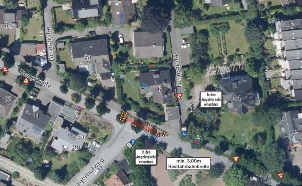 Die Baustelle ist nur eingeschränkt passierbar. Der Verkehr wird von Ampeln geregelt. Aus dem Bergerhofweg kommend, ist das Rechtsabbiegen auf die Bergstraße Richtung B236 für die Dauer der Baustelle nicht möglich. Autofahrer*innen müssen sich beim Linksabbiegen in die Grünphase Richtung Dortmund einfädeln und dann über den Sommerberg nach Schwerte oder Dortmund fahren.