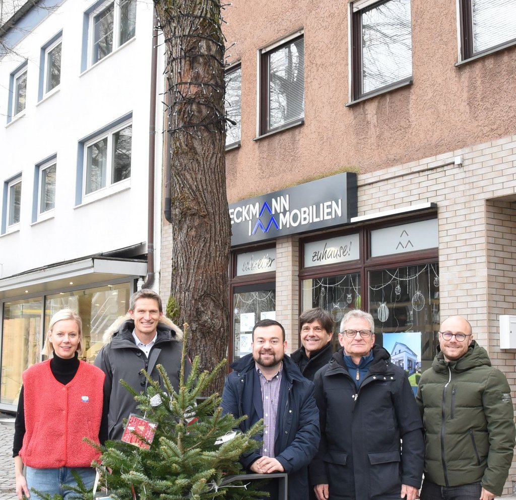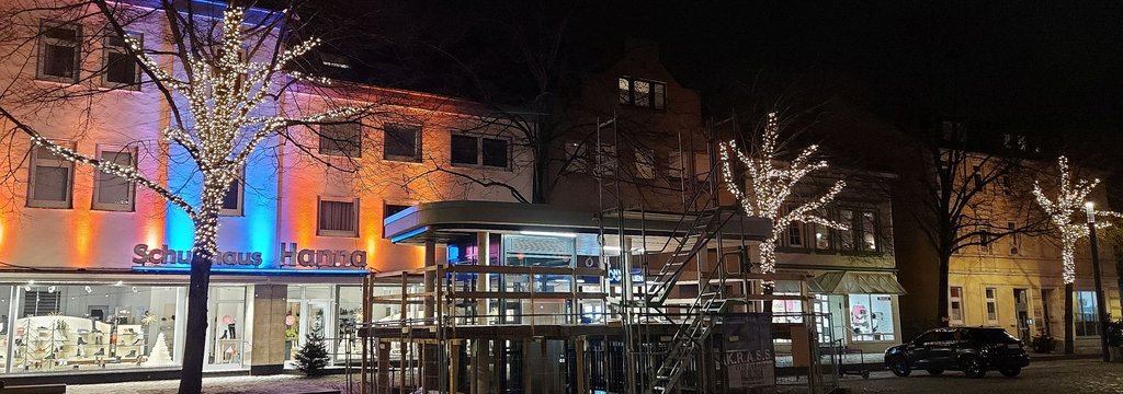 Zu verdanken ist die Installation von mitwachsenden Lichterketten den Stadtwerketöchtern Stadtentwässerung und Elementmedia. Die Stadtwerke selbst liefert den Strom dazu. Zum Ortstermin trafen sich Markus Borchert (SEG), Oliver Weist (Elementmedia) und Heiko Mühlbauer (Öffentlichkeitsarbeit Stadtwerke) mit Bürgermeister Dimitrios Axourgos. „Mit dem Umbau des Platzes hat der Markt eine Aufwertung erfahren, jetzt setzen wir mit den beleuchteten Bäumen das Tüpfelchen aufs i“, befand das Stadtoberhaupt.