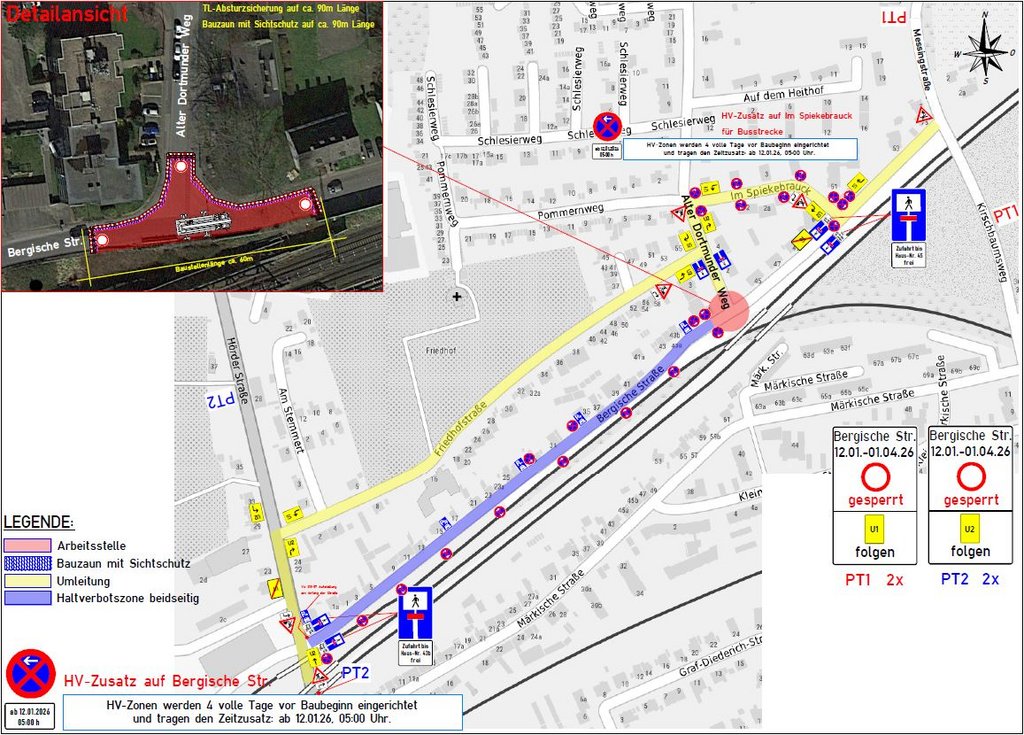 Grund für die Sperrung sind Brückeninstandssetzungsarbeiten. Dafür wird auf der Bergischen Straße ein großer Kran aufgebaut. Umleitungen sind eingerichtet. Sie führen über die Straßen Im Spiekebrauck und Friedhofstraße. Im Spiekebrauck werden Halteverbote eingerichtet.