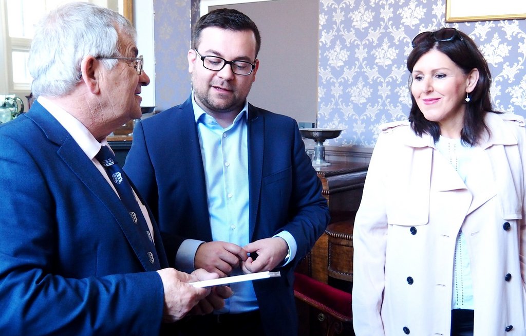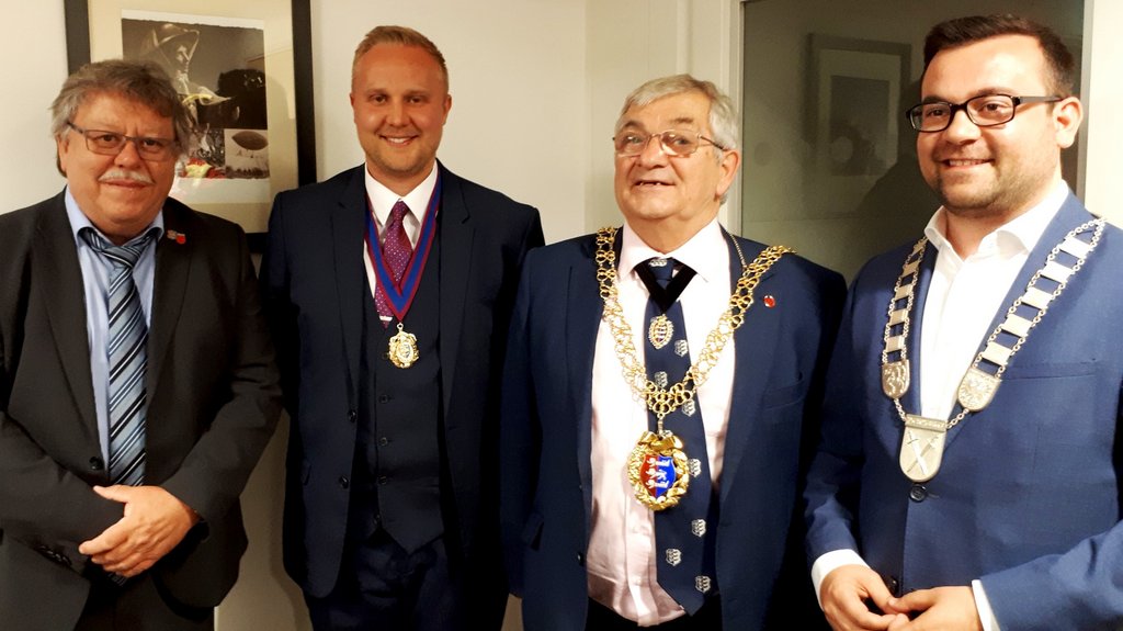 Im Gegensatz zu Deutschland sind die Bürgermeister in England ehrenamtlich tätig. Der Stadtrat wählt sie per Akklamation. Zu dieser Wahl hatte Nigel Colin Sinden seinen Amtskollegen aus Schwerte eingeladen. Wie auch sein Stellvertreter, der Deputy Major James Bacon, wurde Nigel Colin Sinden wiedergewählt. Dimitrios Axourgos und Gabriele Stange gratulierten, nachdem sie zuvor eine exklusive Führung durch die Stadt, die Umgebung und das Rathaus erhalten hatten. In diesem Rahmen überreichten sie auch ein Gastgeschenk in Form eines Buchs über Schwerte.