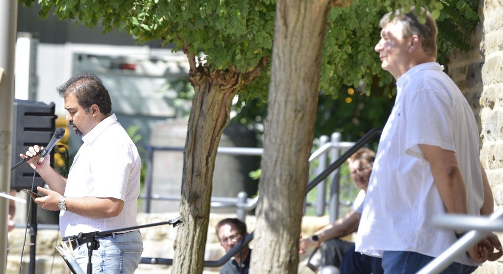 Während der Mahnwache kamen Betroffene aus dem Iran und der Ukraine zu Wort. Sie beschrieben die Situation in ihren Heimatländern, trugen Gedichte vor und erinnerte an die jungen Mohammad Mehdi Karami und Seyed Mohammad Hosseini, die im vergangenen Jahr im Iran hingerichtet worden sind. „Das war eine bewegende Veranstaltung, die viel Empathie ausgestrahlt hat“, bewertete Bürgermeister Dimitrios Axourgos. Mit dem von der Musikerin Astrid Hoffmann in vier Sprachen initiierten Lied „Wir wünschen Frieden für alle“ endete die Mahnwache. Die nächste ist schon terminiert und wird am 24. Februar 2025 stattfinden. Der Ort wird rechtzeitig bekanntgegeben.