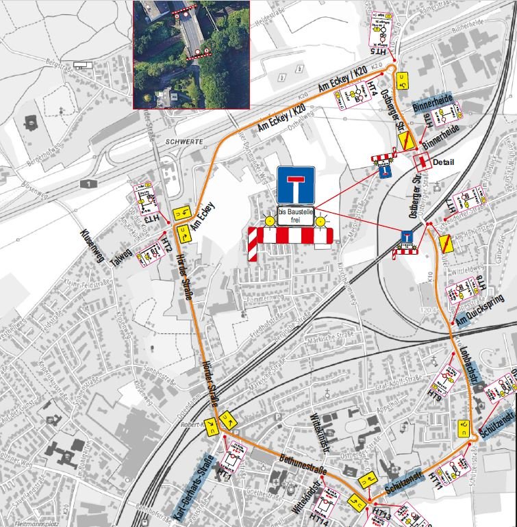 Die Baumaßnahme auf der Kreisstraße beginn schon am Mittwoch, 15. Oktober 2025 mit einer halbseitigen Sperrung der Ostberger Straße im besagten Abschnitt. Am Montag, 20. Oktober 2025, wird dann die Vollsperrung eingerichtet. Bis zum Dezember 2026 wird kein Verkehr mehr auf der Ostberger Straße fließen. Auch Radfahrer*innen und Fußgänger*innen können den Bereich nicht passieren, sondern müssen in beide Richtungen über die Messingstraße ausweichen. Der Umleitungsverkehr für Autos und motorisierte Zweiräder ist ausgeschildert und läuft über Lohbachstraße, Schützenstraße, Bethunestraße, Hörder Straße und Am Eckey und umgekehrt. Offen ist noch, wie die Buslinie C31 der VKU fahren wird. Sobald der Plan vorliegt, informieren wir an dieser Stelle.