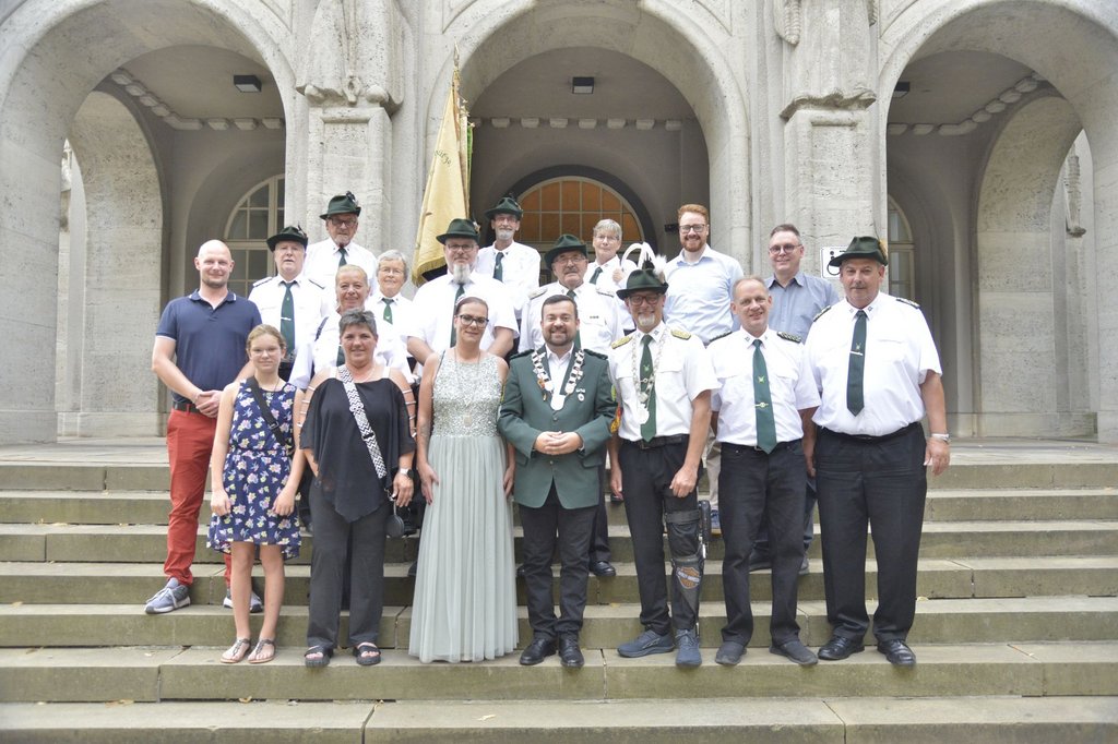 Angeführt wurde die Abordnung vom Vereinsvorsitzenden Axel Schneider und vom amtierenden Königspaar Frank I. (Blum) und Tina I. (Schneider). „Beide sind noch würdige Repräsentanten des Vereins. Sie haben zwei Jahre lang Einsatz, Herzlichkeit und Gemeinschaft gelebt“, sagte Gastgeber Dimitrios Axourgos. Der Bürgermeister betonte, dass das Schützenwesen mehr als nur ein sportlicher Wettbewerb sei. Es ist ein kulturelles Erbe, das weit in die Geschichte unserer Region zurückreicht. Schützenfeste sind ein Stück Lebensqualität, sie machen unsere Ortsteile liebens- und lebenswert, stiften Identität und Gemeinschaftsgefühl“.