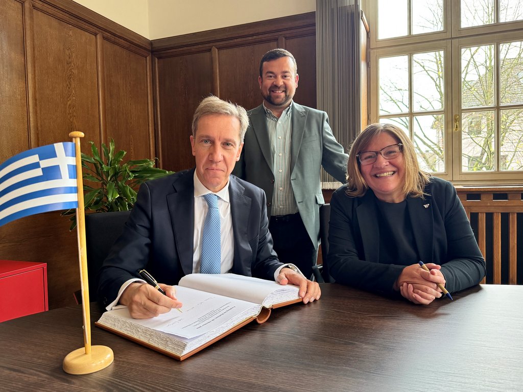 Botschafter Papaioannou, der seit Beginn des Jahres im Amt ist, und Generalkonsulin Baltouma, die ihr Amt erst vor wenigen Wochen angetreten hat, trugen sich beim Empfang in das Goldene Buch der Stadt ein.