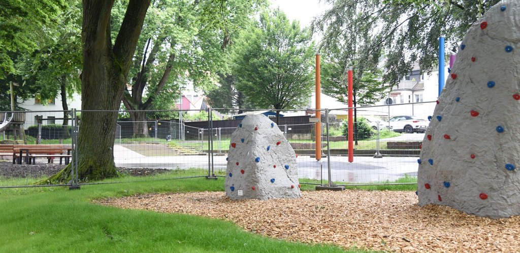 Auf dem Spielplatz sind zwei Bereiche entstanden, die für das Spiel mit dem Wasser neugestaltet wurden. Der eine Wasserspielbereich befindet sich nordwestlich auf dem Spielplatz neben der vorhandenen Sandspielfläche mit dem Piratenschiff. Der andere Wasserspielbereich ist zwischen der Asphaltfläche und dem Bolzplatz vorgesehen. Diese Bereiche werden miteinander über eine Wasserrinne verbunden, die parallel zur Ruhrstraße verläuft. In der Rinne aus Betonpflaster wird das „nicht verspielte“ Wasser und ggf. auch das Regenwasser in die angrenzende Vegetation geleitet, wo dieser und insbesondere dem vorhandenen Baumbestand zur Verfügung steht.
