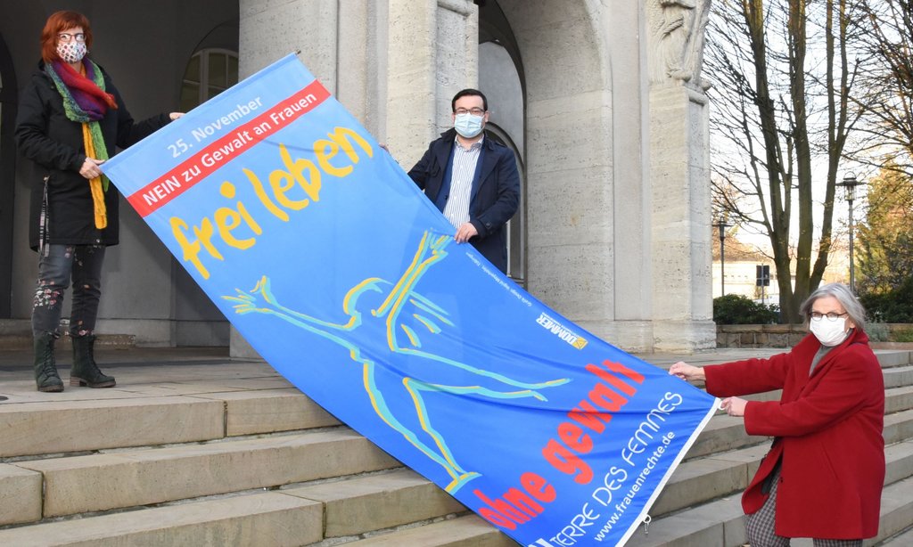 Auch in Schwerte sind Fälle häuslicher Gewalt gegen Frauen registriert worden, alleine 2019 64 Mal. „Nur ein einziger Fall wäre schon einer zu viel“, sagt Birgit Wippermann, Gleichstellungsbeauftragte der Stadt Schwerte. „Mit unserer Fahnenaktion wollen wir betroffenen Frauen Mut machen“. Solidarität und Unterstützung findet sie in der Arbeitsgemeinschaft Schwerter Frauengruppen. Deren Sprecherin Gudrun Körber hatte am Mittwoch die Aktion vor dem Rathaus begleitet.