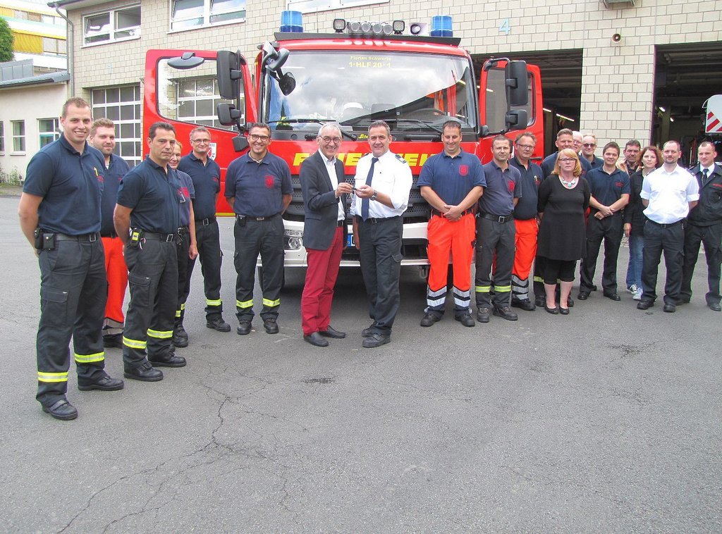 "Es kommt also unseren Bürgerinnen und Bürgern zu Gute. Daher bin ich gerne hier, um Ihnen das Fahrzeug zu übergeben", sagte Bürgermeister Heinrich Böckelühr. "Ich bin mir sicher, dass Sie sehr sorgsam mit dem Fahrzeug umgehen. Bei der Gelegenheit bedanke ich mich aber auch gerne wieder für Ihren vorbildlichen Einsatz", erklärte der Bürgermeister den fast vollzählig anwesenden Feuerwehrleuten.