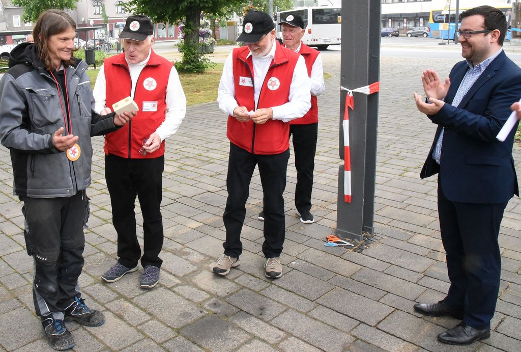 Auch die Eisenbahnfreunde dankten dem Engagement vieler Menschen für das Mahnmal und verliehen für besondere Verdienste einen Orden an Carsten Wischan. Der Mitarbeiter des Baubetriebshofes der Stadt Schwerte hatte sich auch in seiner Freizeit für das Projekt eingesetzt. Mit Mitteln und weiteren Mitarbeiter*innen des Baubetriebshofes war die Portalstütze aufgestellt worden.