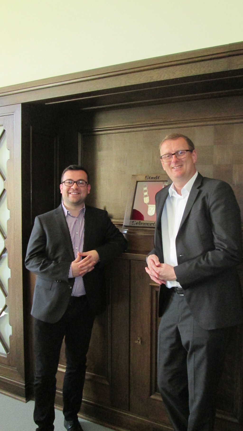 Bürgermeister Dimitrios Axourgos (links) und der Bundestagsabgeordnete Oliver Kaczmarek (rechts) bei ihrer ersten Zusammenkunft im Schwerter Rathaus.