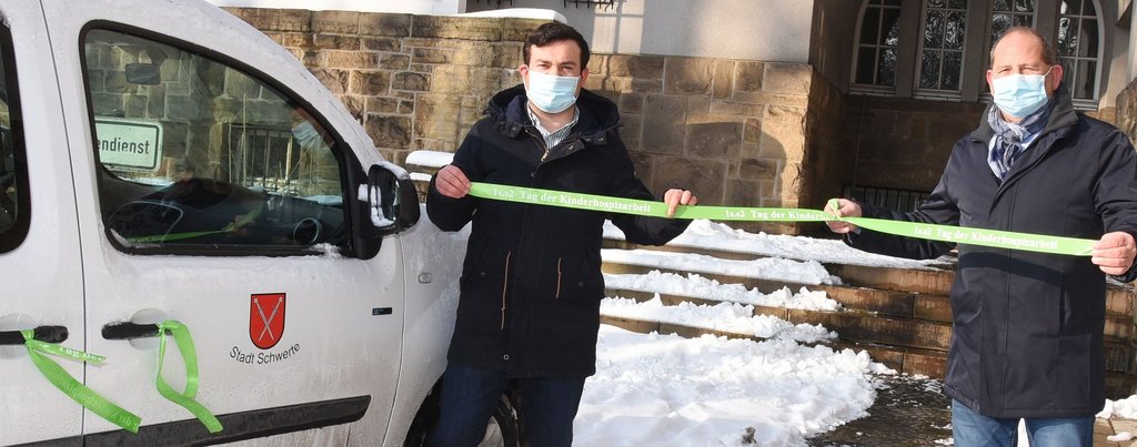 Auch an den Fahrzeugen der Stadt Schwerte flattern diese grünen Bänder. Die Verwaltung solidarisiert sich alljährlich mit dem Ambulanten Kinder- und Jugendhospizdienst des Kreises Unna. Bürgermeister Dimitrios Axourgos gehört zu den Unterstützern der Einrichtung. „Ich helfe gerne und aus Überzeugung mit, die Inhalte der Kinder- und Jugendhospizarbeit bekanntzumachen“, sagt das Stadtoberhaupt. In dasselbe Horn stößt Hans Haberschuss, Erster stellvertretender Bürgermeister der Stadt. „Wir hoffen, mit diesem Akt der Solidarität, dass sich immer mehr Menschen in diesem Bereich für ein ehrenamtliches Engagement gewinnen lassen“.