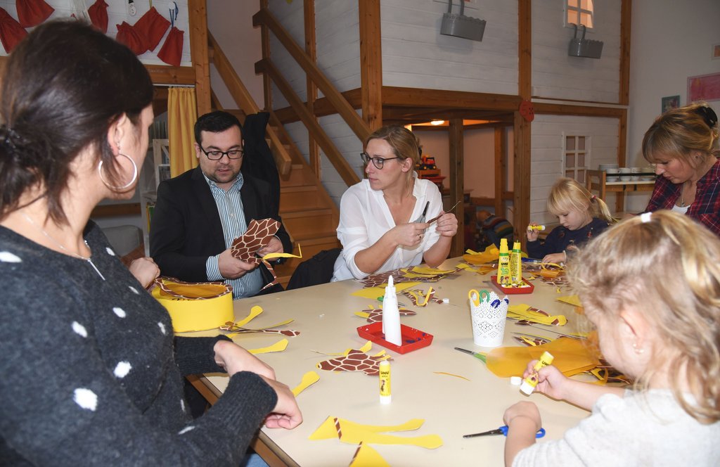 Zum Schluss nahm Dimitrios Axourgos in der Giraffengruppe Platz und unterstützte Mütter und Kinder eine Weile beim Basteln. "Ich freue mich sehr, dass in der Arche alles glatt läuft und die Kinder sowohl in der U3- als auch in der Ü3-Betreuung gut aufgehoben sind", erklärte der Bürgermeister.