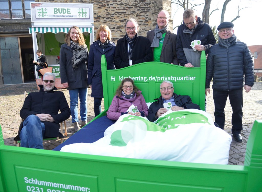 „Schwerte ist eine gastfreundliche Stadt“, erklärt Hans-Georg Winkler, Erster Beigeordneter der Stadt Schwerte, der die Werbekampagne mit seiner Anwesenheit unterstützte. „Wir nehmen gerne Gäste hier auf und haben das in Zusammenhang mit den Städtepartnerschaften schon mehrfach unter Beweis stellen können“. Auch die Evangelischen Kirchengemeinden sind mit im Boot. „Wir wollen gute Gastgeber sein und den Besucherinnen und Besuchern die ganze Herzlichkeit einer Region präsentieren“, erklärte Erich Reinke aus dem Jugendreferat des Kirchenkreises Iserlohn. In Privatquartieren bringt der Kirchentag Menschen unter, die nicht mit Isomatte und Schlafsack in Klassenräumen übernachten können – vor allem Teilnehmende über 35 Jahren, Familien und Menschen mit Behinderungen. Alle Gäste sind dem Kirchentag mit Namen und Anschrift bekannt. Die Gäste reisen am 19. Juni an und bleiben bis zum 23. Juni. Für internationale Gäste werden schon zum 18. Juni Quartiere benötigt. Gebraucht wird nicht viel: ein Bett, ein Sofa oder eine Liege und ein kleines Frühstück am Morgen.