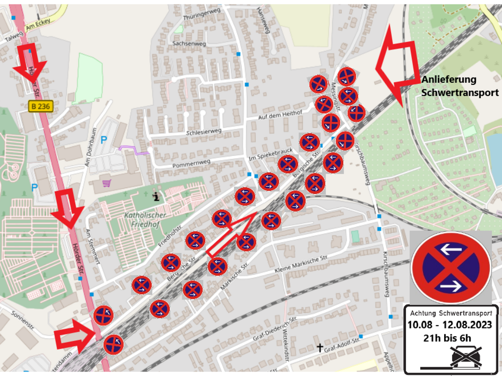 Es ist geplant, dass die Brückenteile in der Nacht vom 10. auf den 11. August 2023 angeliefert werden. Der Schwertransporter wird von der Autobahn kommend die Hörder Straße herunterfahren und dann nach links in die Bergische Straße einbiegen. Damit eine ausreichende Breite gewährleistet ist, hat die zuständige Verkehrsbehörde der Stadt Schwerte in der Zeit von Donnerstag, 21 Uhr, bis zum Samstag, 6 Uhr, ein absolutes Halteverbot entlang der Bergischen Straße angeordnet. Autos, die in der besagten Zeit trotzdem dort abgestellt sind, müssen kostenpflichtig abgeschleppt werden.