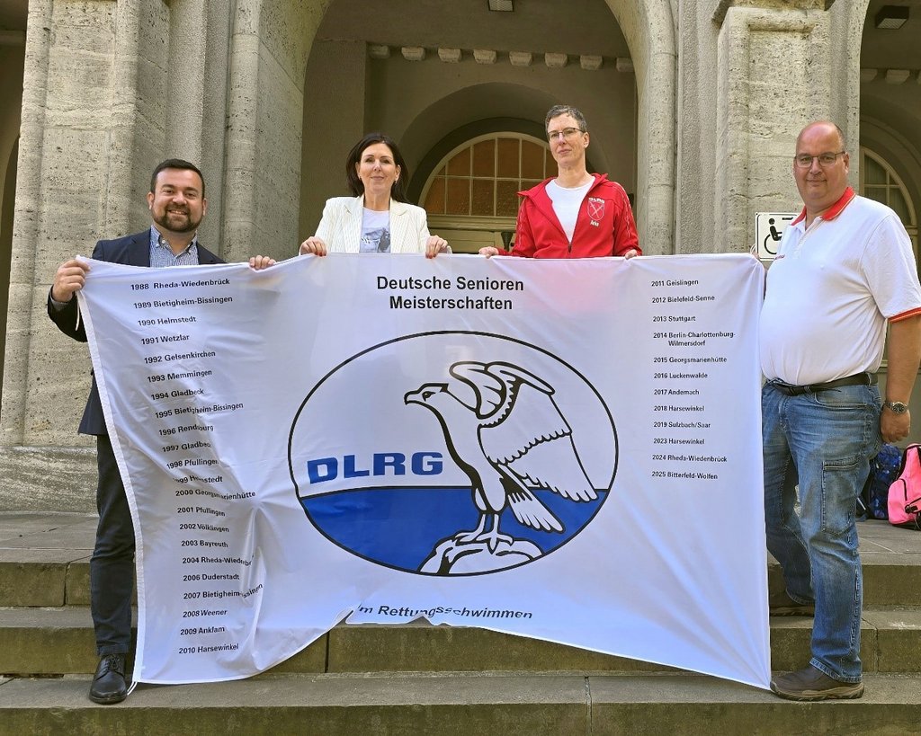 Die DLRG Ortsgruppe Schwerte hat vor wenigen Tagen den offiziellen Zuschlag erhalten, vom 30.04.-03.05.2026 die Deutschen Seniorenmeisterschaften im Rettungsschwimmen in Schwerte ausrichten zu dürfen. „Eine besondere Ehre für uns als Schwerter Sportstadt und eine tolle Auszeichnung für die heimische Ortsgruppe der DLRG“ so Dimitrios Axourgos, der gerne persönlich gratulierte. Auch eine herausfordernde Aufgabe, so die beiden Überbringer der Nachricht, die daher bereits jetzt mit der Organisation des Wettbewerbes beginnen. „Wir erwarten rund 1000 Sportler*innen aus dem ganzen Bundesgebiet, dafür müssen wir eine entsprechende Infrastruktur bereithalten“, so das DLRG Team, das sich über die Unterstützungszusage des Rathauschefs und seiner für den Sport zuständigen persönlichen Referentin Gabriele Stange freuen konnte.