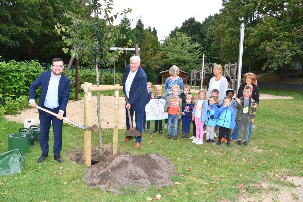 Und so pflanzten Dimitrios Axourgos und Hans-Georg Winkler im schönen Garten der Kita Tausendfüßler einen Eisenholzbaum. Die Kinder beobachteten ganz genau, was die Herren in ihrem Garten so machten. Der Bürgermeister und sein ehemaliger Stellvertreter beantworteten dabei souverän, aber humorvoll die vielen Fragen der Kinder. Später stellten zwei Mitarbeiter des Baubetriebshofes die Umgebung und Wasserversorgung der Bäume fertig.