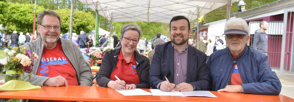 Beim Treffen mit dem Verwaltungsvorstand der Stadt Schwerte hatte das Elsebad im Herbst vergangenen Jahres auf seine wirtschaftlich angespannte Lage aufmerksam gemacht. Dimitrios Axourgos und Kämmerer Niklas Luhmann hatten diesen Hilferuf zum Anlass genommen, um Möglichkeiten einer größeren Unterstützung durch die Stadt prüfen zu lassen. Jetzt sind es 6.000 Euro mehr, die dem Elsebad jährlich aus dem Stadtsäckel zufließen. „Damit würdigen wir auch die große ehrenamtliche Leistung, die hier im Elsebad Jahr für Jahr aufgebracht wird“, erklärte das Stadtoberhaupt. Der geschäftsführende Vorstand der Elsebad GmbH mit Dr. Hartwig Carls-Kramp, Annette Wild und Dieter Requardt bedankten sich für das Mehr an Unterstützung.