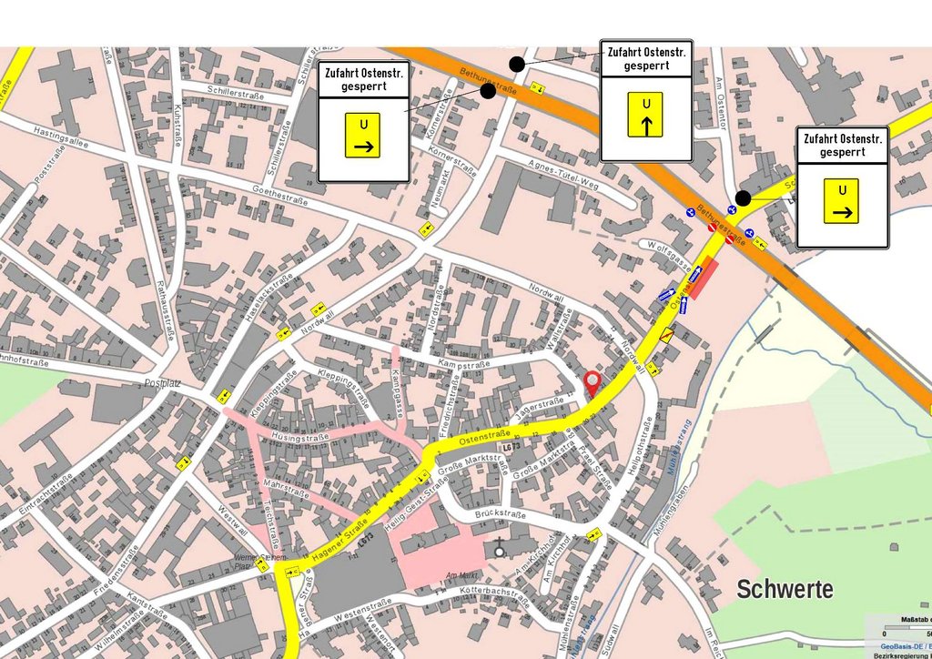 So wird von Dienstag (3. September) an die Einfahrt in die Ostenstraße von der Bethunestraße aus nicht möglich sein. Weil für den Gehwegneubau und den Bau der Bushaltestelle viel Platz benötigt wird, kann ein Begegnungsverkehr in der Ostenstraße nicht zugelassen werden. Eine Umleitungsstrecke ist ausgeschildert und führt über Nordwall, Friedenstraße, Westwall, Hagener Straße, Brückstraße und Hellpothstraße zur Ostenstraße. Die Maßnahme dauert bis zum 30. September.