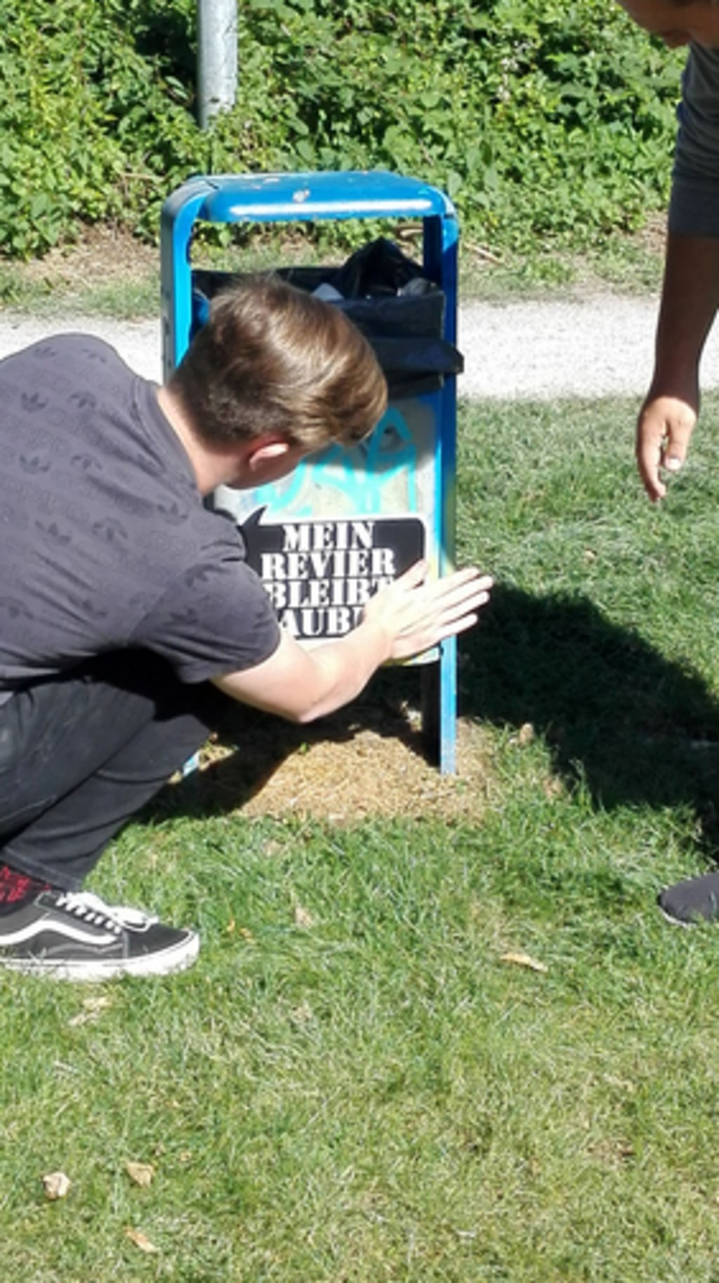 Die Aufkleber zieren verschiedene motivierende Sprüche mit Lokal- und Popkulturbezug, die vorher in regelmäßigen Treffen von der Jugendgruppe erarbeitet wurden. "Jetzt hoffen wir, dass unsere Aktion auch was bringt und der Müll dort landet, wo er hingehört", meint die Gruppe einstimmig.