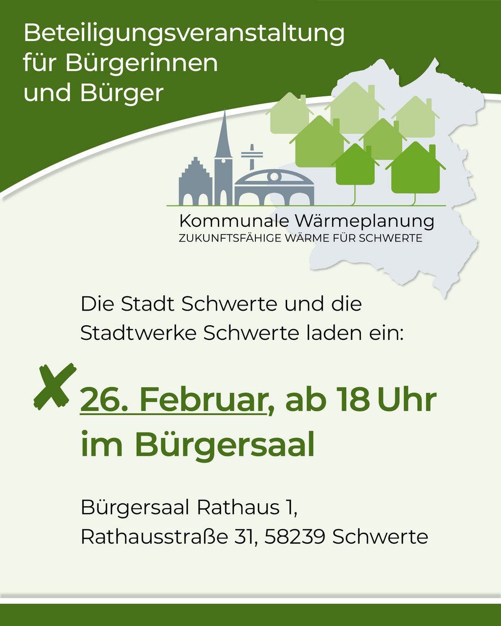 Am 26. Februar 2026 um 18 Uhr findet im Bürgersaal des Rathauses Schwerte eine öffentliche Beteiligungsveranstaltung zur Kommunalen Wärmeplanung statt. Zunächst werden die Ergebnisse des Entwurfs vorgestellt. Bürger*innen haben dann an mehreren Thementischen die Möglichkeit, Fragen zu stellen und Anregungen einzubringen. Zudem wird über verschiedene Energieberatungsangebote informiert.