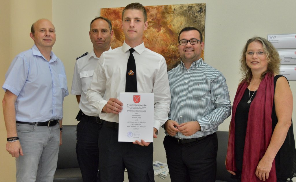 Dominik Veith fand bei der Freiwilligen Feuerwehr Holzwickede Interesse, dauerhaft für eine Feuerwehr zu arbeiten. Also begann er in Schwerte eine Ausbildung zum hauptberuflichen Feuerwehrmann und Rettungssanitäter. Seine Ausbildung schloss er bei der Berufsfeuerwehr Hagen am 30. September 2016 ab. Seit dem 1. Oktober 2016 ist der heute 24-Jährige im Einsatzdienst der Wache in Schwerte. Während dieser Zeit war er Beamter auf Probe. Jetzt hat er die Ernennungsurkunde aus der Hand des Bürgermeisters erhalten.