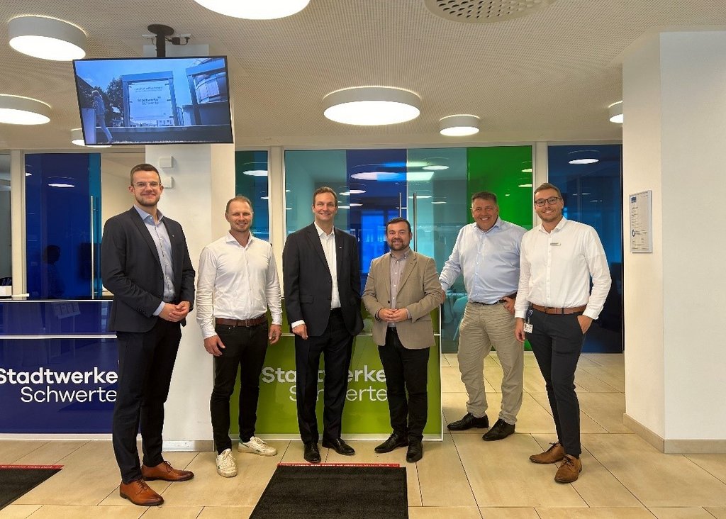 Gemeinsam mit seinen beiden Wirtschaftsförderern besuchte Bürgermeister Dimitrios Axourgos die Räume der Stadtwerke an der Bahnhofstraße. Begrüßt wurde er vom Stadtwerke-Geschäftsführer Sebastian Kirchmann und vom Team des Kundenzentrums mit Teamleiter Marc Westkämper.