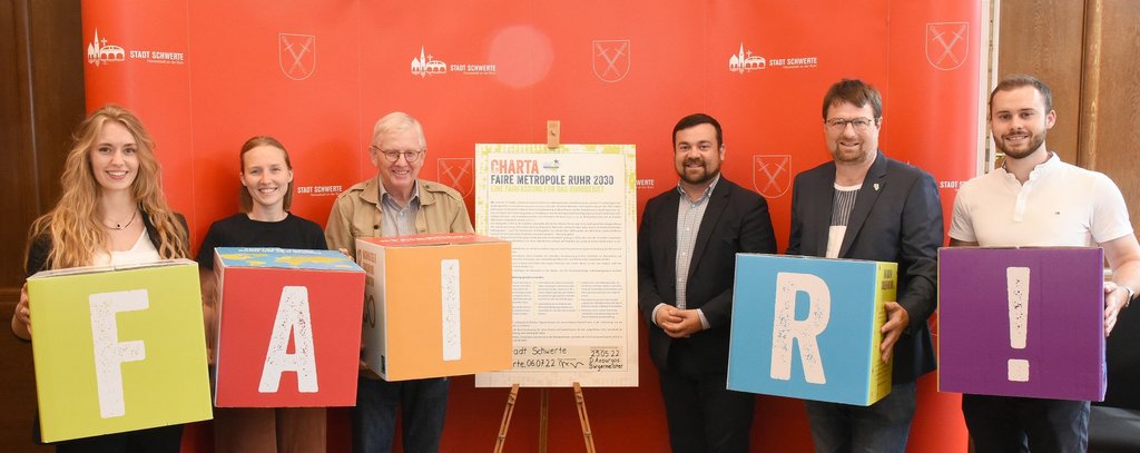 Das geschieht auch in der Gesamtschule Gänsewinkel und im Ev. Kindergarten Schwerte-Ost; beide Einrichtungen sind Fairtrade-Schule bzw. Fairtrade-KiTa. „Wir bekennen uns jetzt zu den 17 Nachhaltigkeitszielen der Vereinen Nationen, folgen den sieben Zielen der Charta und wollen durch bestimmte Maßnahmen wie den Kauf fairer Produkte oder gemeinsame Durchführung von Informationsveranstaltungen mit der Fairtrade-Steuerungsgruppe den fairen Handel stärken“, so der Bürgermeister. Schwerte ist seit 2014 eine Fairtrade-Stadt.