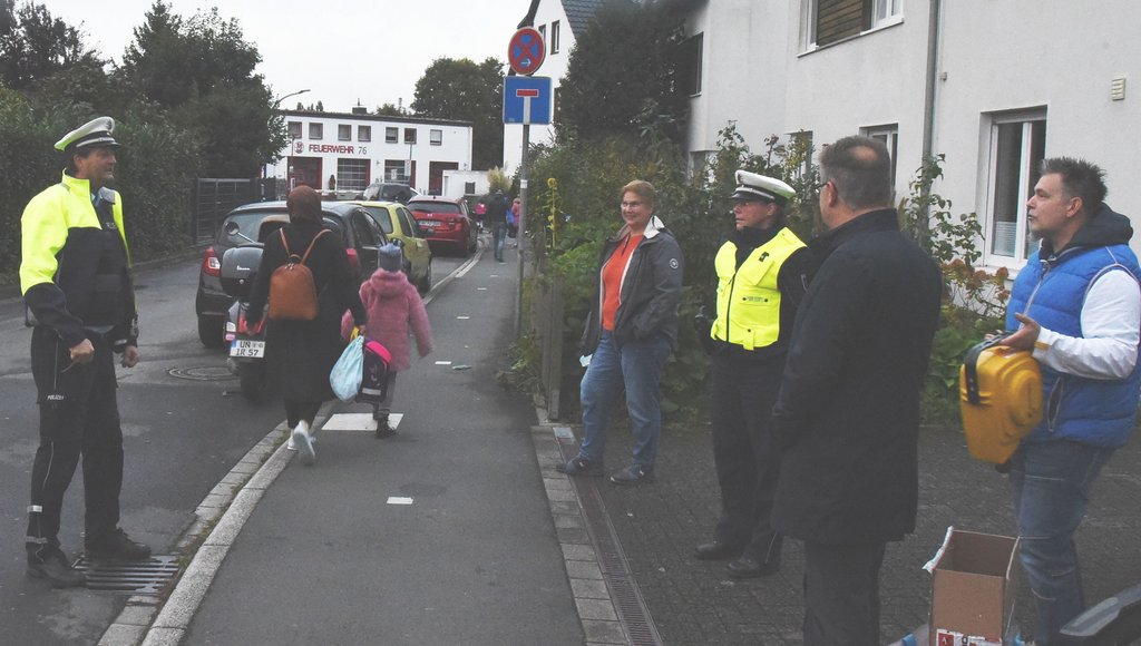 „Wir wollen ein korrektes Verkehrsverhalten in das Bewusstsein derjenigen Eltern rücken, die ihre Kinder morgens früh mit dem Pkw zur Schule bringen“, erklärt Peter Kranhold, Leiter des Schulverwaltungsamtes der Stadt Schwerte. Weil immer wieder Fahrzeuge in den abgebundenen Teil des Meiner Wegs fahren und ihre Kinder im Wendehammer vor der Feuerwehr aus dem Wagen lassen, „entstehen durch Rückwärtsfahren und Begegnungsverkehr immer wieder gefährliche Situation für die Grundschüler*innen“, beschreibt Karsten Kullik von der Schwerter Polizei. Als Bezirksbeamter ist er für den Ortsteil Westhofen zuständig und war am Montag mit seiner Kollegin Anja Ojdowski an Ort und Stelle.