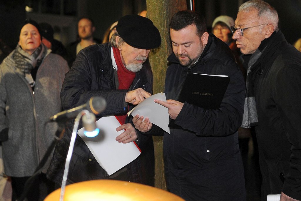 Zu den Rednern der Mahn- und Gedenkfeier gehörte auch Bürgermeister Dimitrios Axourgos. „Wir müssen gemeinsam allen Formen von Judenfeindschaft und Antisemitismus entschieden entgegentreten“, forderte das Stadtoberhaupt. Er sei froh, „hier und heute engagierte Frauen und Männer zu sehen, die ein Zeichen für Zivilcourage setzen. Wir brauchen die Zivilcourage jedes Einzelnen, die bedingungslose Solidarität mit und zu Menschen aus dem Judentum, aus dem Christentum, dem Islam und anderen Religionen“ und bedankte sich bei den Organisatoren der Gedenkveranstaltung. Das waren wieder die Schwerter Friedensinitiative, die Institutionen Pax Christi und Ökumene-Arbeit, dem Schwerter Bündnis gegen Rechts, dem gemeinsamen Theaterprojekt von Studio 7, dem Bündnis gegen Rechts, dem Kinder- und Jugendparlament der Stadt, dem Kulturbüro im Kultur- und Weiterbildungsbetrieb der Stadt Schwerte, namentlich Pfarrer Fritz-Günter Held „für seinen unermüdlichen persönlichen Einsatz im Namen von Erinnerung und Mahnung, für die Gleichheit aller Menschen und gegen Hass und Hetze.“
