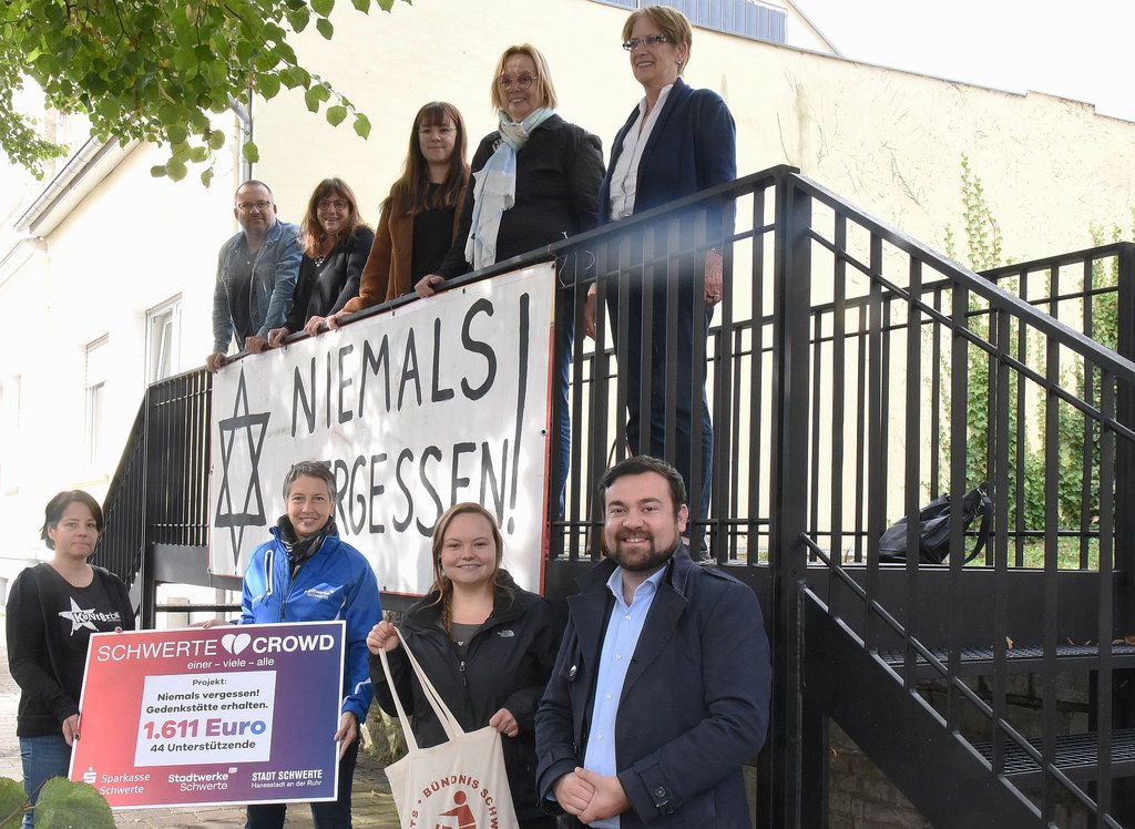 Noch zu Beginn des Jahres blätterte der Lack von der "Treppenbrücke" an der Gedenkstätte der ehemaligen Synagoge in der Großen Marktstraße. Nachdem aus der Schwerter Bürger:innenschaft der Wunsch nach Überarbeitung der "Treppenbrücke" kam, nahm das Bündnis Schwerte gegen Rechts sich der Sache an und organisierte die Finanzierung und koordinierte die Arbeiten der Schwerter Fachfirmen. Mit Hilfe der Schwerter Freiwilligenagentur "Die Börse" konnte zur Mitfinanzierung der Heimatcheck des Ministerium für Heimat, Kommunales, Bau und Gleichstellung des Landes Nordrhein-Westfalen erlangt werden. Auch der Kultur- und Weiterbildungsbetrieb der Stadt Schwerte unterstützte die Renovierung.