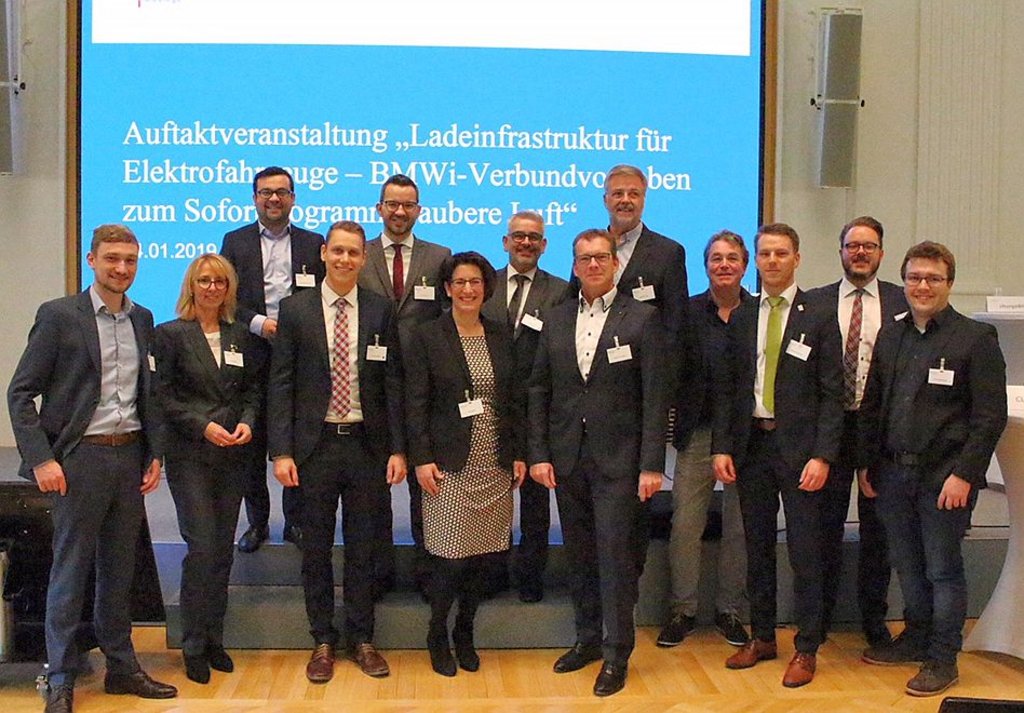 Die Kosten für die Errichtung der Ladeinfrastruktur werden vollständig durch den Bund gefördert. Einer Einladung des BMWi nach Berlin sind die Konsortialpartner am Montag den 14. Januar .2019 gefolgt. Die Stadt Schwerte war mit dem Bürgermeister Dimitrios Axourgos (3. v. l.), dem zentralen Projekt- und Fördermanager Jan Sommer (5. v. l.), dem Geschäftsführer der Stadtwerke Schwerte Michael Grüll (5. v. r.) nd dem Projektleiter seitens der Stadtwerke Schwerte Holger Gies (7. v. r.) vertreten.