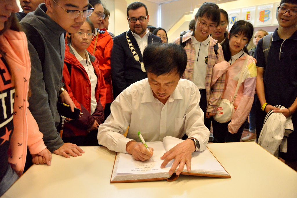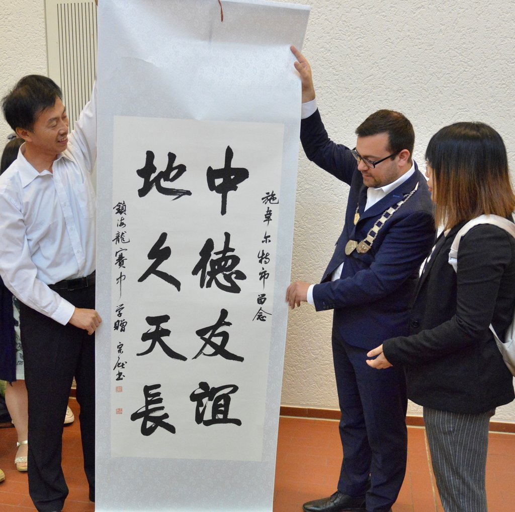 Seit 2010 unterhält die Gesamtschule Gänsewinkel freundschaftliche Kontakte zur Longsai Senior Middle School. Dass der Schwerter Schule dieser Austausch von großer Wichtigkeit ist, unterstrich Markus Hippert, stellvertretender Leiter der Gesamtschule. Im Gegenzug hob auch Delegationsleiter Zhao den Wert der gegenseitigen Kontakte hervor. So werden Schüler*innen der Gesamtschule im nächsten Jahr nach Ningbo fliegen, um den Austausch zu vertiefen. Wie wichtig der für die chinesischen Gäste ist, dokumentiert das Geschenk an Bürgermeister Dimitrios Axourgos. Der nahm eine Kalligraphie sehr beeindruckt entgegen; mit der Kunst des Schönschreibens unterstrichen die chinesischen Gäste, dass ihnen die Freundschaft mit Schwerte eine Herzensangelegenheit ist.