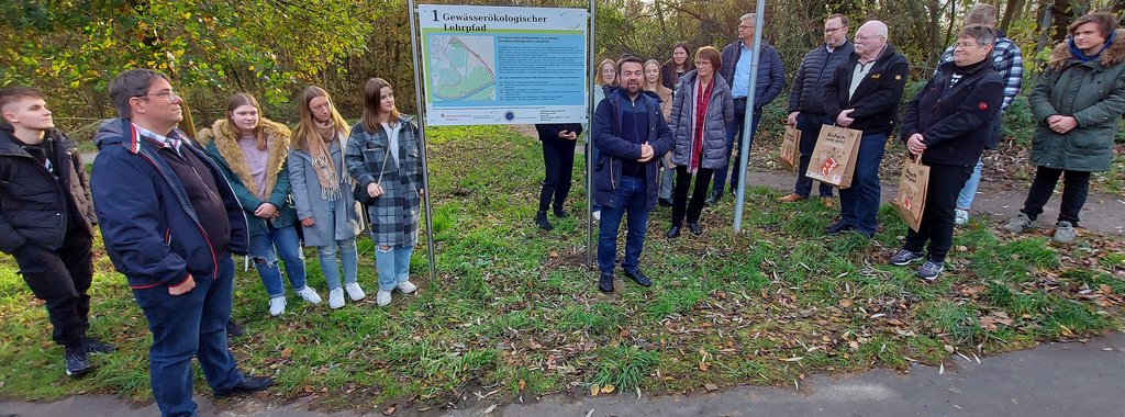 Dimitrios Axourgos würdigte das Engagement der Schüler*innen, den Lehrpfad als „ein tolles und hochaktuelles Projekt, mit dem Sie etwas für die Stadtgesellschaft hinterlassen haben“. Das Stadtoberhaupt dankte dem Sportanglerverein Schwerte und Umgegend, der Grund und Boden für das Aufstellen von Informationstafeln zur Verfügung gestellt hat. Die Sparkassenstiftung hat eine erhebliche Unterstützung geleistet. Unterstützung und Hilfe erfuhren die Projektler*innen um Lehrer Remon Hippert aber auch durch den Förderverein des RTGs, durch die Volksbank, den Firmen Biotrans, Zapp, Blumen Risse, Itemis und durch die Stadt Schwerte.