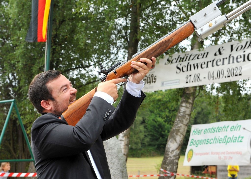 Den ersten Schuss im Vogelschießen gab Bürgermeister Dimitrios Axourgos ab. Er ist gern gesehener Gast auf den Schützenfesten im Ruhrtal und bekennt sich zu den Traditionen. „Ich bin vor allem fasziniert von dem Volksfestcharakter – es macht einfach Freude, mit den Schützinnen und Schützen zu feiern“, sagte das Stadtoberhaupt.