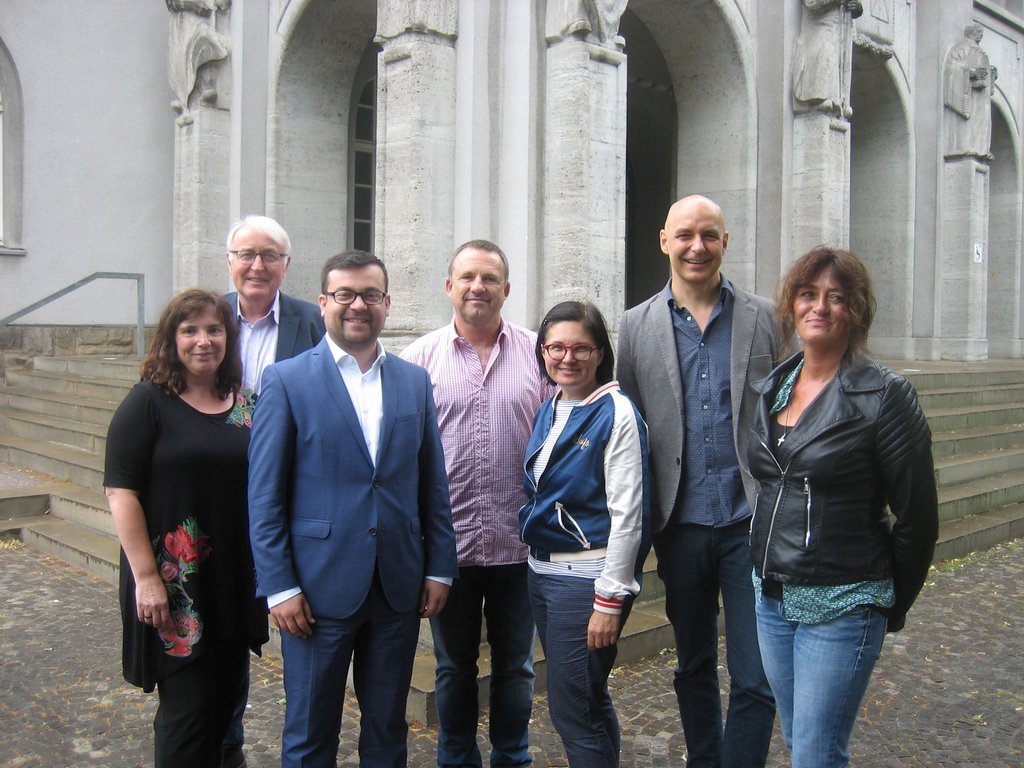 (v.l.) Anja Scheiwe (Kulturbüro), Vorsitzender des Verwaltungsrates des KuWeBe und Erster Beigeordneter Hans-Georg Winkler, Bürgermeister Dimitrios Axourgos, stellvertretender Vorstand KuWeBe Matthias Hein, Andrea Reinecke (Kulturbüro), Holger Ehrich (künftiger Leiter des Kulturbüros), Claudia Lonzer (Kulturbüro).