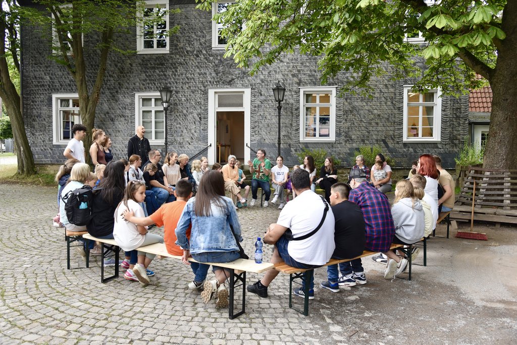Unter den Titeln „Traumtore zählen doppelt“ und „Wuckenhofrebellen“ wurden in den beiden Betreuungswochen eine Vielzahl von Workshops angeboten. Diese umfassten Theater- und Schauspielkurse, Kunstprojekte sowie Foto- und Filmworkshops. Am vergangenen Freitag präsentierten die Kinder im Rahmen einer Ausstellung stolz die Ergebnisse ihrer kreativen Arbeit ihren Eltern, Verwandten und Freunden. „Es war beeindruckend zu sehen, wie sich die Kinder in so kurzer Zeit in die Gruppe eingefunden, entwickelt und künstlerisch entfaltet haben“, sagte Christian Mogk, Jugendpfleger der Stadt Schwerte, zur Begrüßung der Gäste.