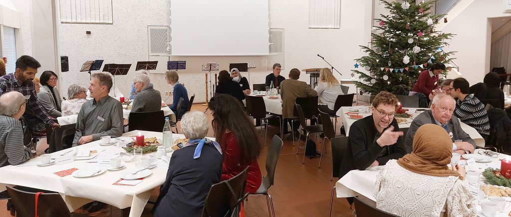 Bei Weihnachtsgebäck und Kaffee waren an den weihnachtlich geschmückten Tischen Vertreter*innen des Integrationsrates und der Ratsfraktionen, der Migrantenvereine, des Hindu-Tempels, des AK Asyls und der evangelischen und katholischen Kirche sowie weitere Akteur*innen der Integrationsarbeit vereint, um bei gemeinsamen Gesprächen ein paar gemütliche Stunden miteinander zu verbringen.