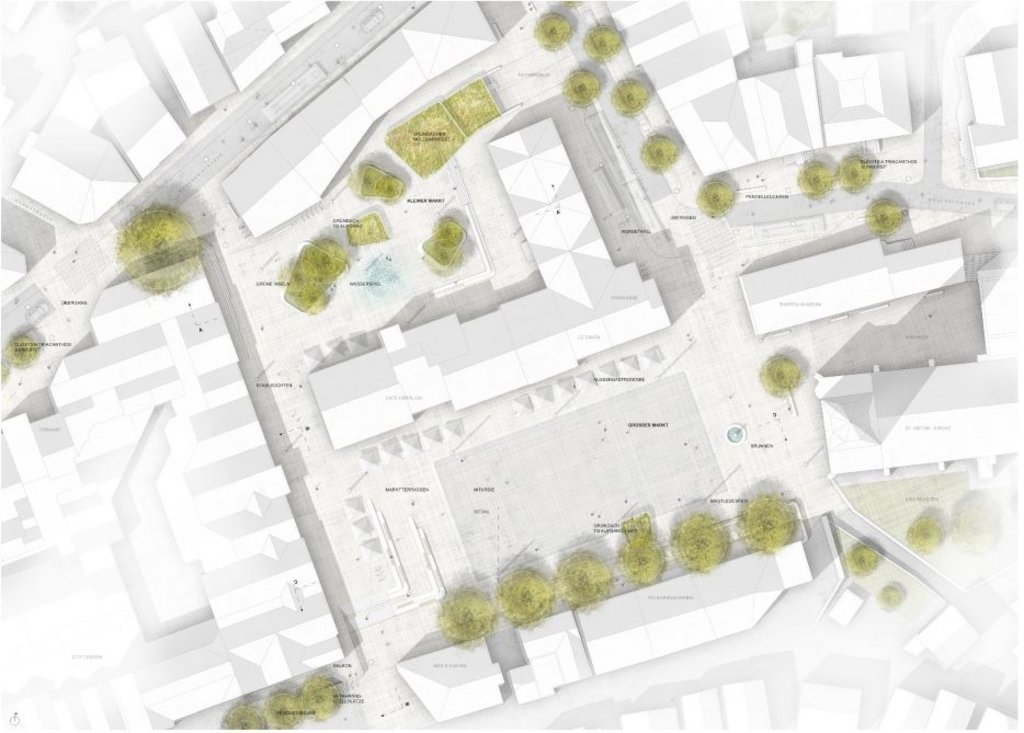 In den nächsten Wochen wird das das Büro Riehl Bauermann und Partner aber auch mit Verbesserungsvorschlägen der Jury auseinandersetzen müssen, etwa eine reduziertere Treppenkonstruktion, die teilweise Nutzung des vorhanden Bodenmaterials oder auch eine höhere Aufenthaltsqualität am südlichen Marktplatz. Insgesamt hatte das Büro jedoch viele überzeugende Lösungen für die Attraktivitätssteigerung des Marktplatzes und der Umgebung.