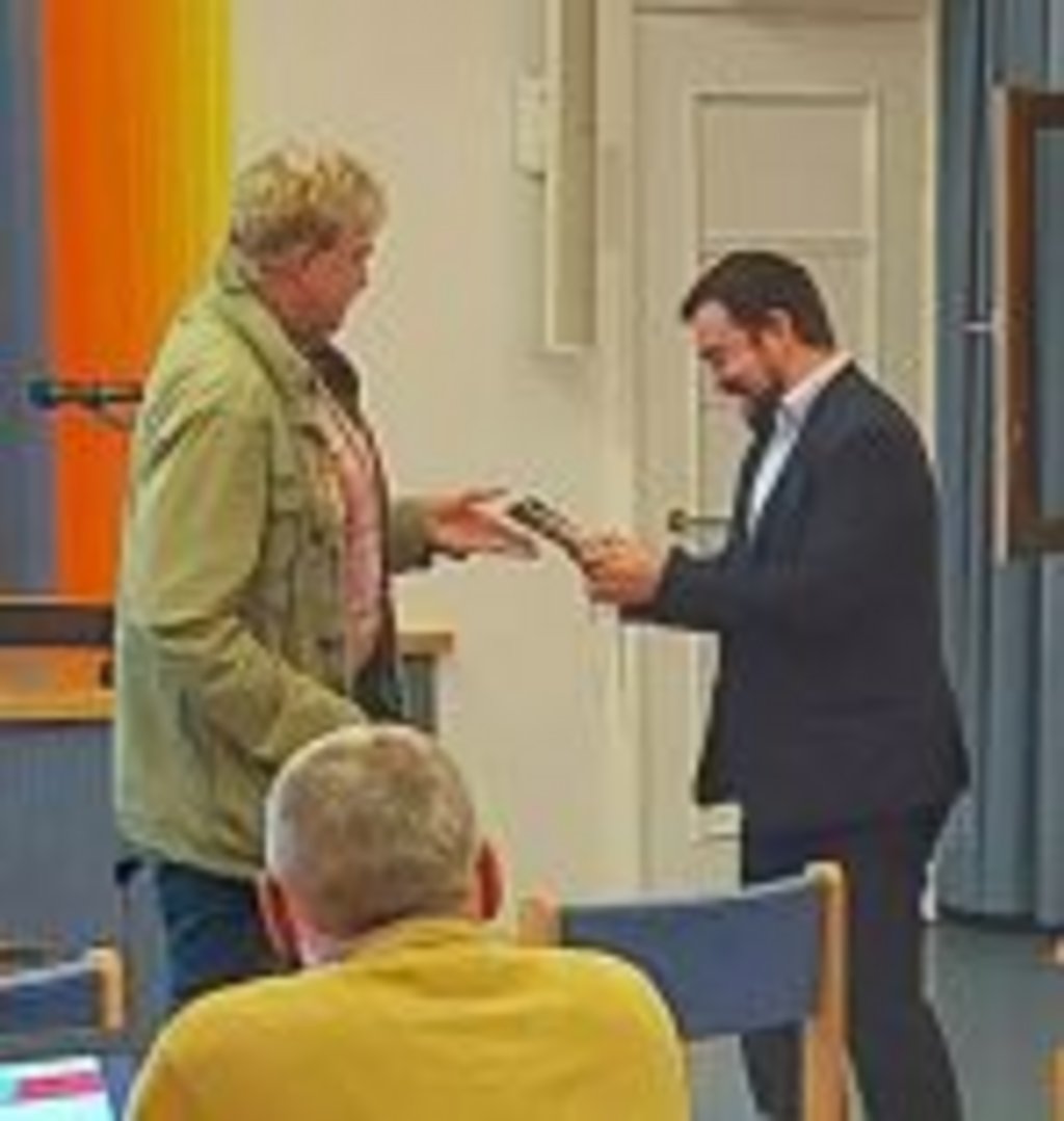 Nette Geste am Rande: Uwe Förster überreichte dem Bürgermeister ein liniertes Notizbuch. Titel: New York, Rio, Schwerte-Westhofen.