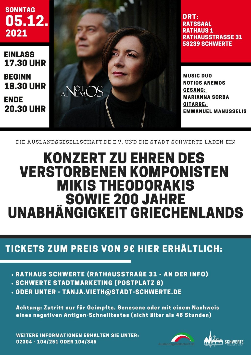 Die Veranstalter konnten für diesen kulturellen und internationalen Abend die Sängerin Marianna Sorba und den Gitarristen Emmanuel Manusselis gewinnen, die an die großartige Musik des Komponisten Mikis Theodorakis erinnern und diese aufleben lassen. Der im September 2021 verstorbene Theodorakis war einer der bekanntesten griechischen Komponisten und wird in seiner Heimat und international verehrt. Besonders seine Filmmusiken zu Alexis Sorbas, Z und Serpico machten ihn weltweit bekannt.